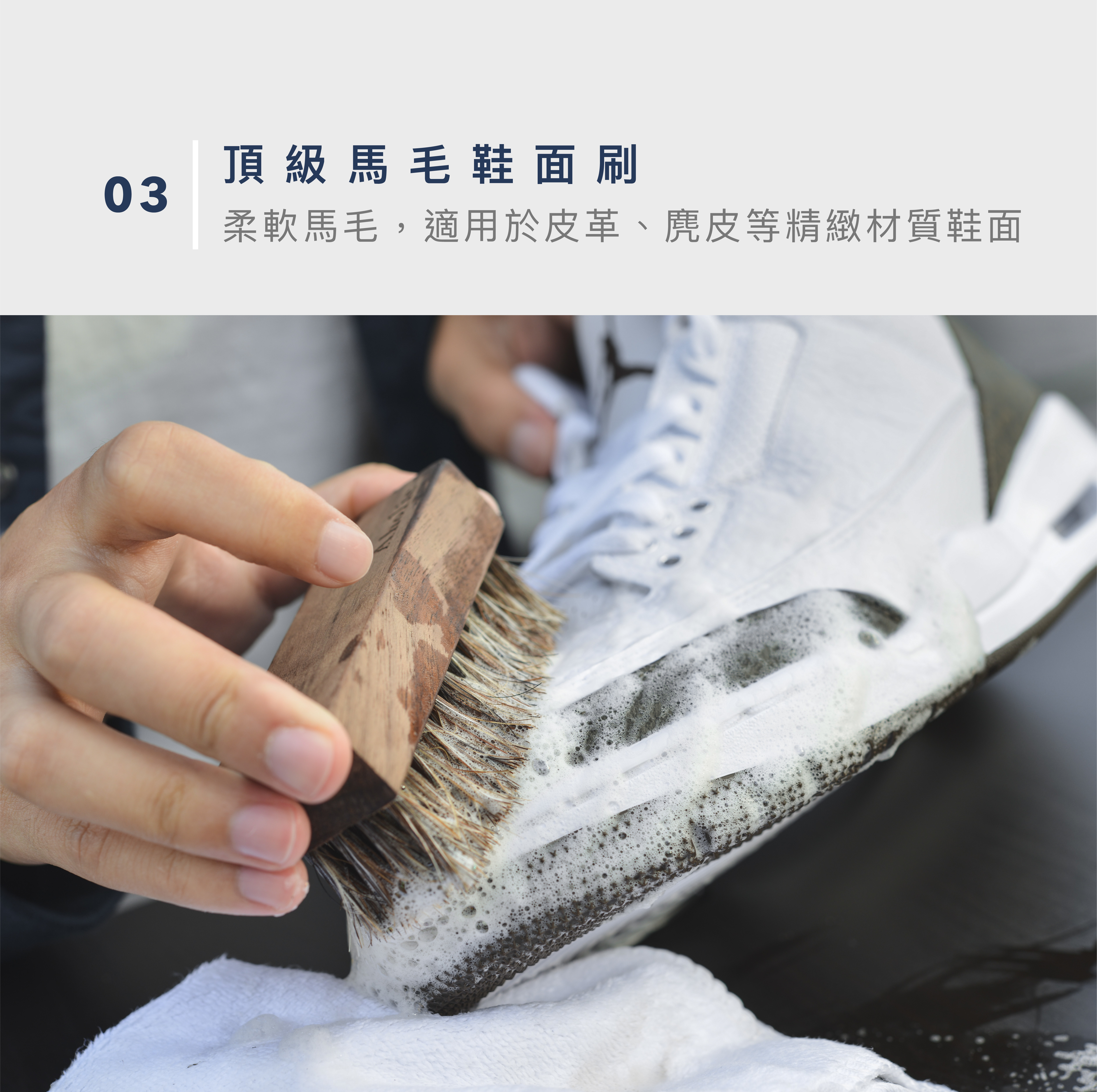 頂級馬毛鞋面刷: 適用於皮革、麂皮、網布、帆布等纖細鞋面